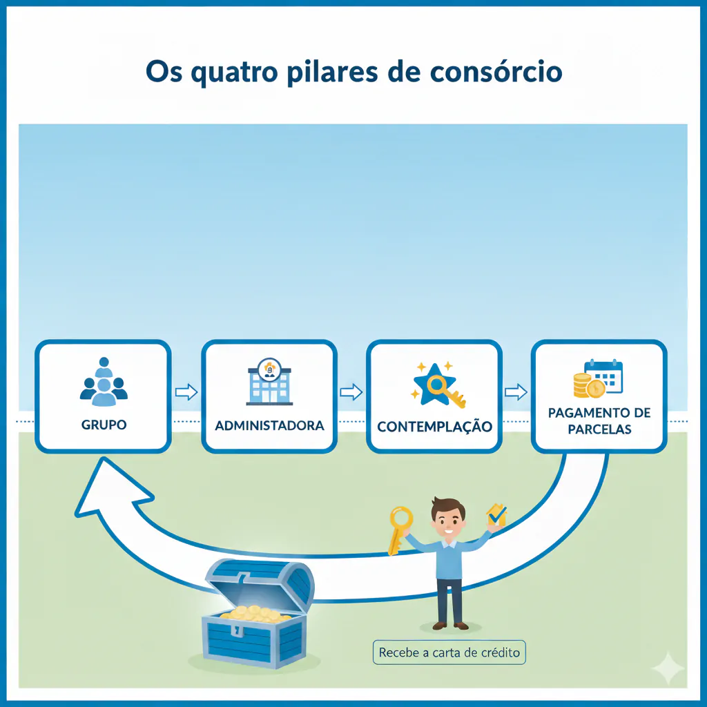 Para entender como funciona o consórcio em sua totalidade, é crucial compreender seus quatro pilares fundamentais: